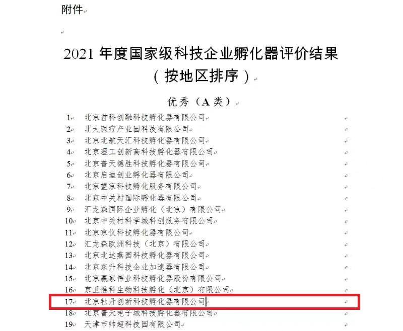 国家级科技企业孵化器A类(优秀)评定(牡丹创新孵化器) |